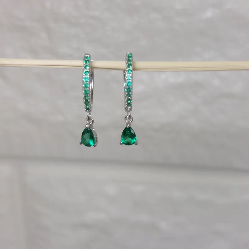 Μοντέρνοι κρίκοι από ασήμι 925, διακοσμημένοι με σειρά από λαμπερές πέτρες από συνθετικό σμαράγδι κατά μήκος της μπροστινής τους όψης. Κάτω από κάθε κρίκο κρέμεται μια εντυπωσιακή πέτρα σε σχήμα σταγόνας, προσδίδοντας ένα ζωντανό και κομψό χρώμα. Τα σκουλαρίκια έχουν μήκος 12.5mm.