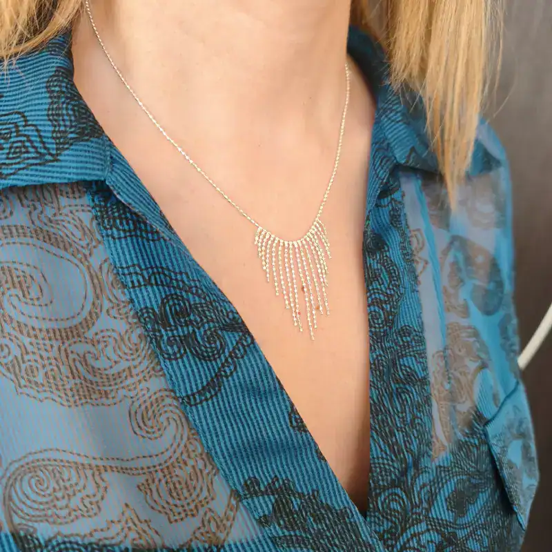 Ένα εκθαμβωτικό κολιέ που αιχμαλωτίζει το φως. Διαθέτει ένα εντυπωσιακό σχέδιο “καταρράκτη” από αστραφτερά κρύσταλλα/ζιργκόν, που κρέμονται κομψά από μια λεπτή αλυσίδα από ασήμι 925. Ιδανικό για να προσθέσει glamour στις βραδινές σας εμφανίσεις, σε επίσημες εκδηλώσεις ή για να αναβαθμίσει ένα απλό outfit. Το μήκος της αλυσίδας είναι 40cm.