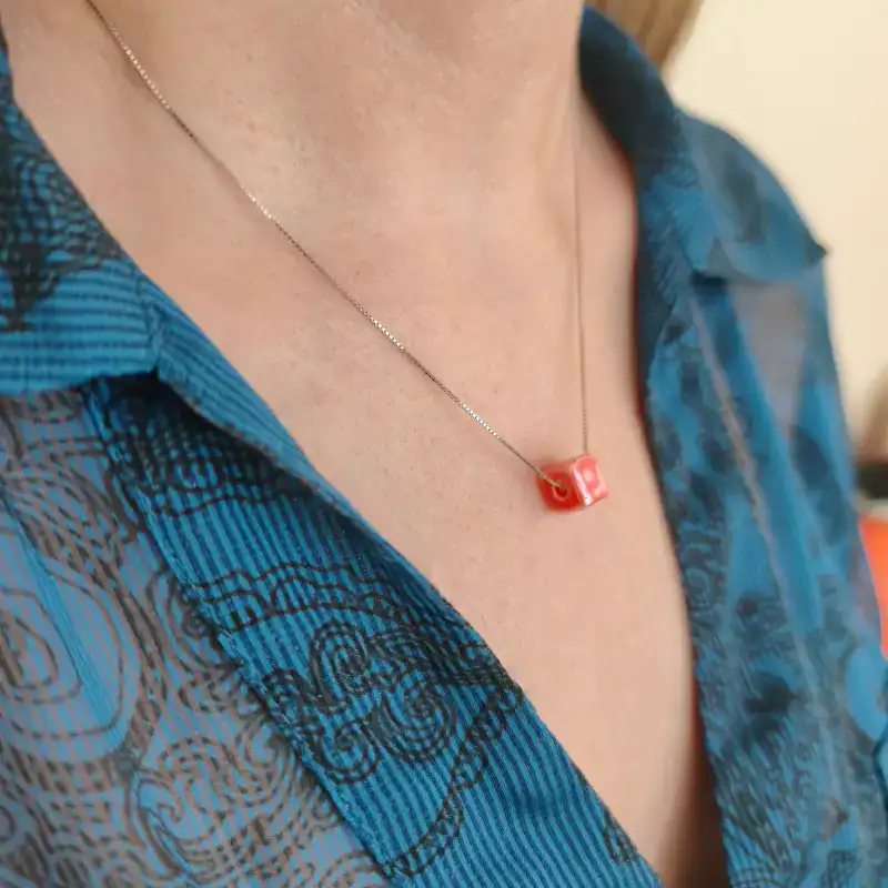 Ένα μοντέρνο και φωτεινό κολιέ από ασήμι 925, ιδανικό για να προσθέσει μια ζωηρή πινελιά χρώματος στην εμφάνισή σας. Η λεπτή ασημένια αλυσίδα συνοδεύεται από έναν κύβο σε μια ζεστή και φωτεινή ροζ-κοραλί απόχρωση. Ιδανικό για να ανανεώσετε το καθημερινό σας στυλ ή να το συνδυάσετε με άλλα κοσμήματα για ένα μοναδικό layering. Το μήκος της αλυσίδας είναι 40cm.