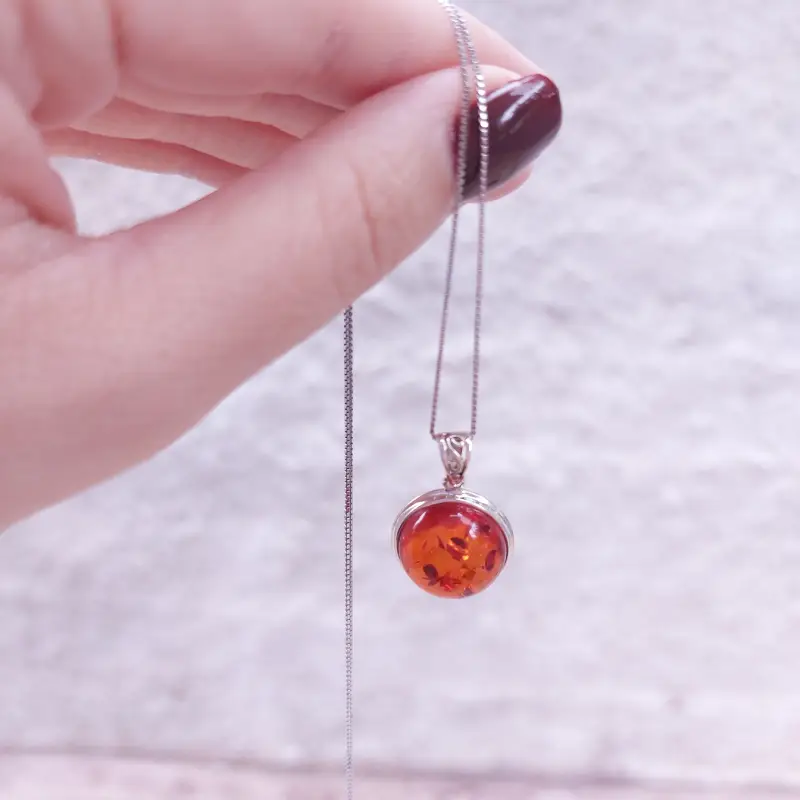 Το κολιέ διαθέτει μια λεπτή αλυσίδα από ασήμι 925 και ένα εντυπωσιακό μενταγιόν. Το κεντρικό στοιχείο είναι μια στρογγυλή πέτρα κεχριμπαριού, με πλούσια, βαθιά πορτοκαλο-καφέ απόχρωση. Το κεχριμπάρι, ως φυσικό υλικό, κρύβει μέσα του μοναδικά μοτίβα, κάνοντας κάθε κομμάτι πραγματικά μοναδικό. Αυτό το κόσμημα είναι ιδανικό για να προσθέσει μια ζεστή και γήινη νότα στο καθημερινό σας στυλ, ενώ η διαχρονική του αξία το καθιστά ένα υπέροχο δώρο. Το κολιέ έχει μήκος 50cm.