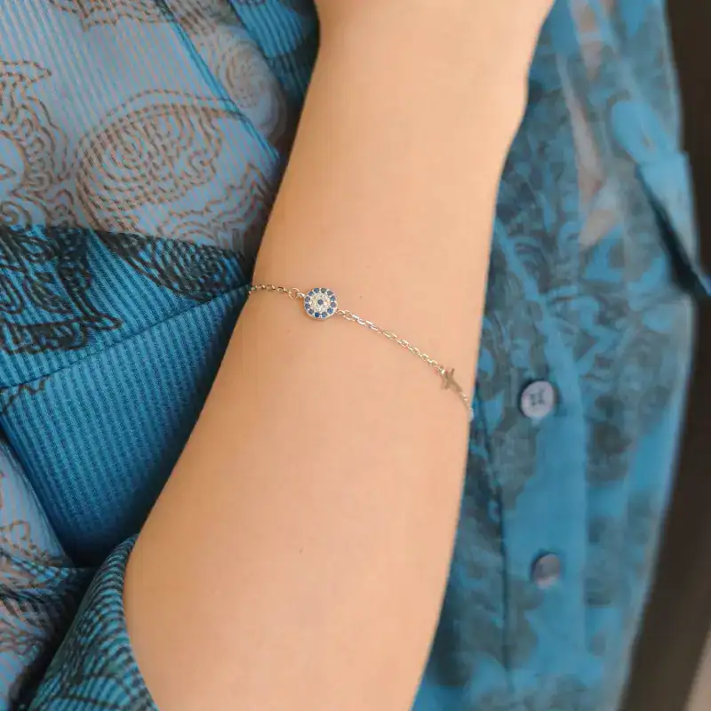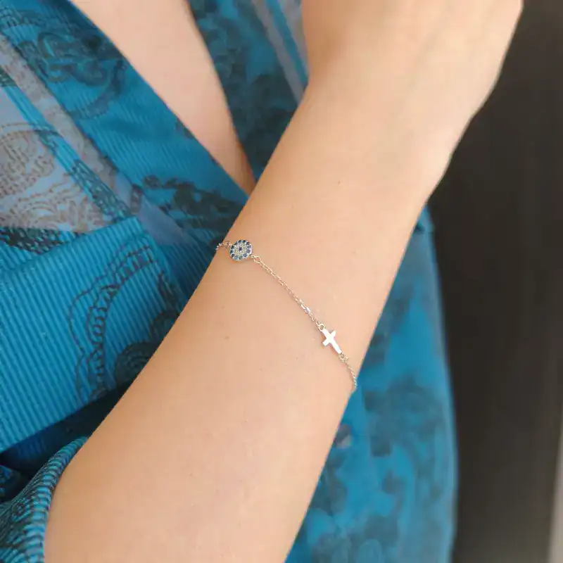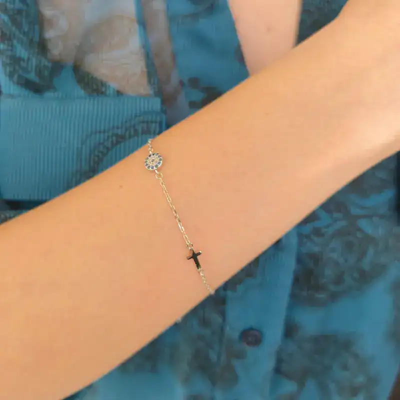 Ένα μοντέρνο βραχιόλι από ασήμι 925, με ένα λαμπερό μάτι διακοσμημένο με μπλε και λευκά ζιργκόν, καθώς και έναν κομψό σταυρό. Το κόσμημα διαθέτει αλυσίδα προέκτασης 5cm στο κούμπωμα για τέλεια εφαρμογή.