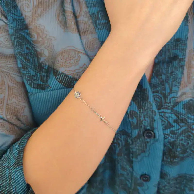 Ασημένιο βραχιόλι μάτι με πέτρες ζιργκόν και σταυρό- Guardian Charm