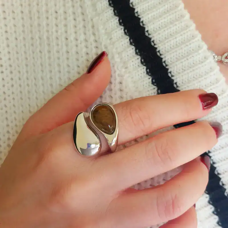 Ασημί δαχτυλίδι από ανοξείδωτο ατσάλι σε ανοιχτή γραμμή με πέτρα Tiger’s Eye. Tο δαχτυλίδι αυτό είναι ενα statement κομμάτι με έντονη διάθεση. Ιδανικό για όσες αγαπούν τα μεγάλα δαχτυλίδια που ξεχωρίζουν, θυμίζοντας vintage luxury κοσμήματα.