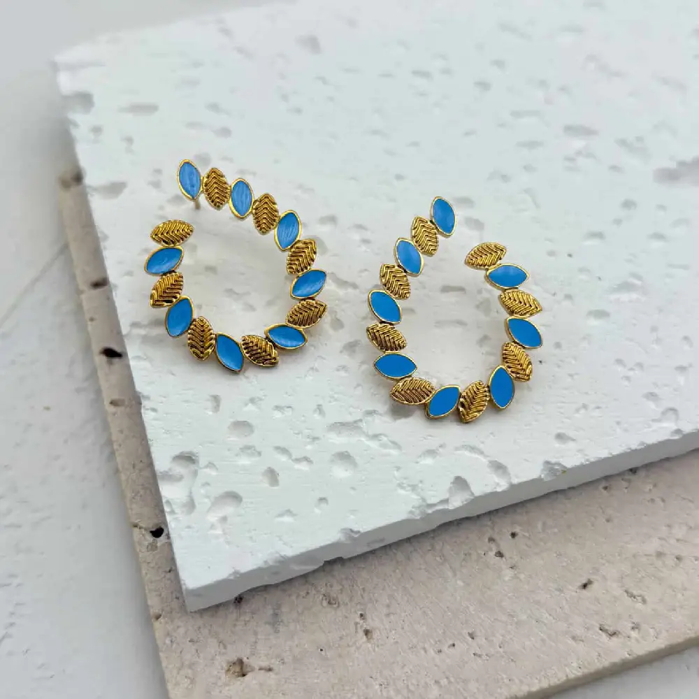Σκουλαρίκια από επιχρυσωμένο ανοξείδωτο ατσάλι, που διαθέτουν ένα μοναδικό σχέδιο από μικρά, ανάγλυφα φύλλα σε μπλε σμάλτο. Ο συνδυασμός του λαμπερού χρυσού και του δροσερού μπλε δημιουργεί ένα κόσμημα γεμάτο φρεσκάδα και καλοκαιρινή διάθεση, ιδανικά για να προσθέσετε μια παιχνιδιάρικη και κομψή πινελιά χρώματος στην εμφάνισή σας, αναδεικνύοντας την ανεμελιά και το προσωπικό σας στυλ.
