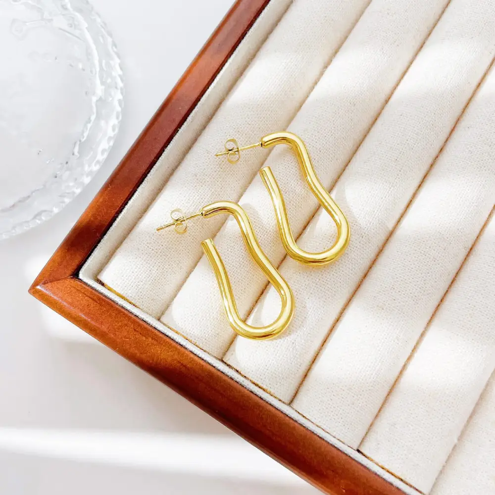 Eπιχρυσωμένα σκουλαρίκια από ανοξείδωτο ατσάλι, που διαθέτουν ένα μοναδικό, αφηρημένο κυματιστό σχήμα. Η λαμπερή του απόχρωση σε συνδυασμό με την τολμηρή, σύγχρονη γραμμή τους δημιουργούν ένα κόσμημα γεμάτο στυλ και πρωτοτυπία, ιδανικά για να προσθέσετε μια καλλιτεχνική πινελιά σε κάθε σας εμφάνιση, αναδεικνύοντας την αυτοπεποίθηση και την αγάπη σας για το μοντέρνο design. Το μέγεθος των σκουλαρικιών είναι 20mm x 12mm.
