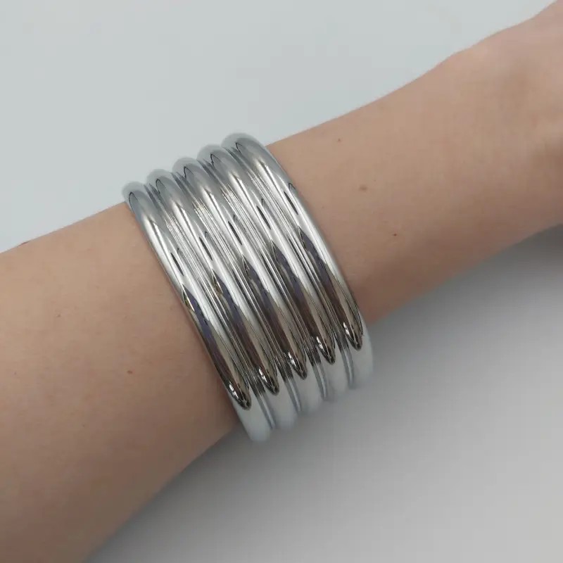 Φαρδιά χειροπέδα ανοιχτή από ανοξείδωτο ατσάλι. Η χειροπέδα έχει εντυπωσιακές, ανάγλυφες γραμμές που δίνουν μια μοντέρνα και δυναμική υφή. Είναι ανοιχτή και ρυθμιζόμενη, με διάμετρο 6.2cm και μπορεί να προσαρμοστεί εύκολα. Αυτή η χειροπέδα είναι το ultimate statement κομμάτι για κάθε σου εμφάνιση. Τόλμησε να φορέσεις δύο τέτοιες χειροπέδες ή μια ασημί και μία επίχρυση και το look σου θα γίνει ακόμα πιο τολμηρό.