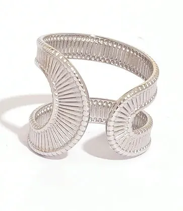 Ατσάλινο δαχτυλίδι με έντονο αρχιτεκτονικό χαρακτήρα και σύγχρονο design, από ανοξείδωτο ατσάλι. Ο σχεδιασμός του αποτελείται από δύο ασύμμετρα, καμπυλωτά τμήματα σε σχήμα “C” που “αγκαλιάζουν” το δάχτυλο χωρίς να ενώνονται, προσφέροντας ένα δυναμικό οπτικό αποτέλεσμα. Μπορεί να φορεθεί με το κενό προς τα πάνω ή αντίθετα.