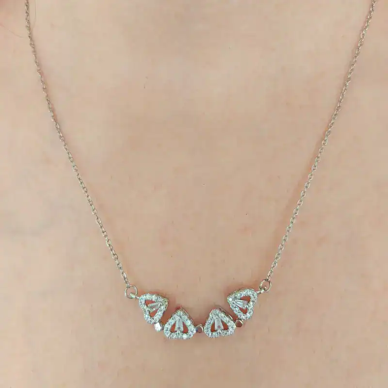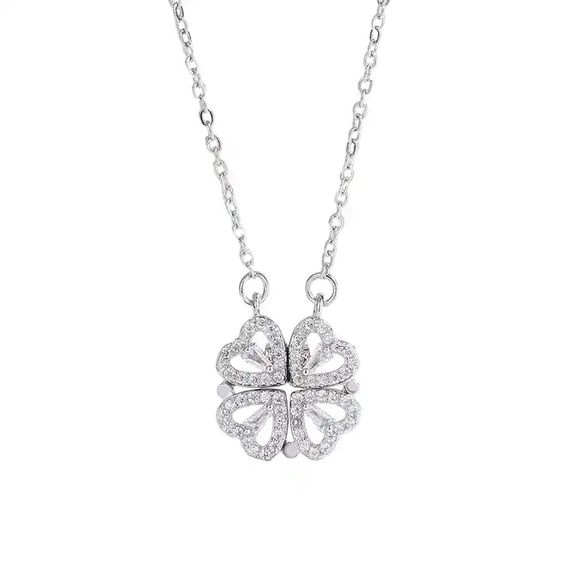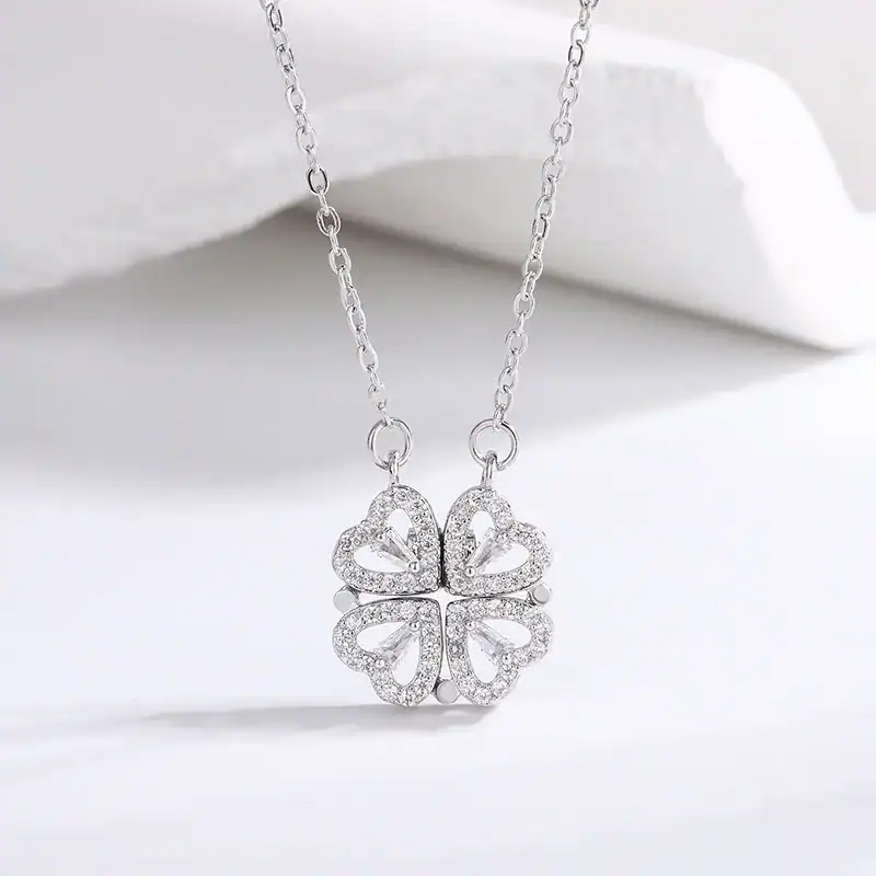 Πρωτοποριακό κολιέ από ανοξείδωτο ατσάλι που διαθέτει τέσσερις μικρές καρδιές γεμάτες λαμπερά ζιργκόν, οι οποίες ενώνονται μαγνητικά για να σχηματίσουν ένα τυχερό τετράφυλλο τριφύλλι. Με μια απλή κίνηση, ο μαγνήτης απελευθερώνεται και το μενταγιόν μεταμορφώνεται σε μια κομψή σειρά από τέσσερις ανεξάρτητες καρδιές. Είναι το απόλυτο “transformer” αξεσουάρ που συνδυάζει τον συμβολισμό της τύχης με τη ρομαντική διάθεση της καρδιάς. Χάρη στον λαμπερό ασημί του τόνο, ταιριάζει με κάθε outfit και αποτελεί ένα μοναδικό κομμάτι. Το μήκος του κολιέ είναι 40cm ενώ έχει και αλυσιδάκι επέκτασης +5cm.