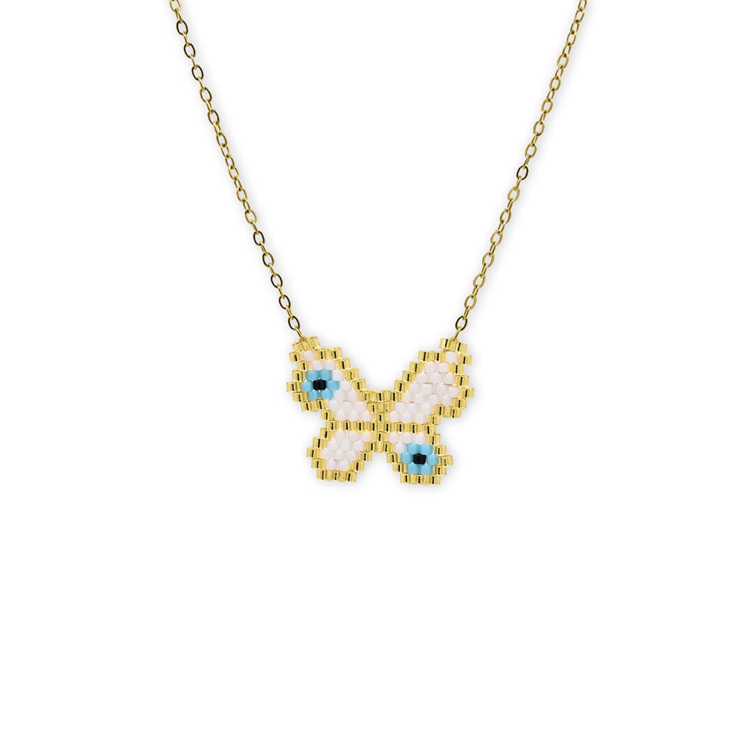 Ατσάλινο κολιέ με κρεμαστό στοιχείο πεταλόυδα, φτιαγμένο με χάντρες MIYUKI σε λευκό και χρυσό με διακριτικά ματάκια. Αυτό το κολιέ μπορεί να αναδείξει λευκά σύνολα και μπορεί να συνδυαστεί εύκολα με άλλα επίχρυσα κοσμήματα. Η αλυσίδα φτάνει τα 46cm με το αλυσιδάκι προέκτασης.