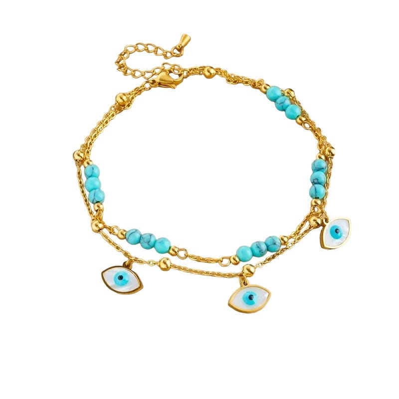 Βραχιόλι ποδιού από επιχρυσωμένο ανοξείδωτο ατσάλι, με διπλή αλυσίδα και charms (τιρκουάζ χάντρες και ματάκια). Μια boho-chic επιλογή για τις καλοκαιρινές σας εμφανίσεις. Το βραχιόλι έχει μήκος 20cm (διαθέτει και αλυσίδα επέκτασης + 5cm).