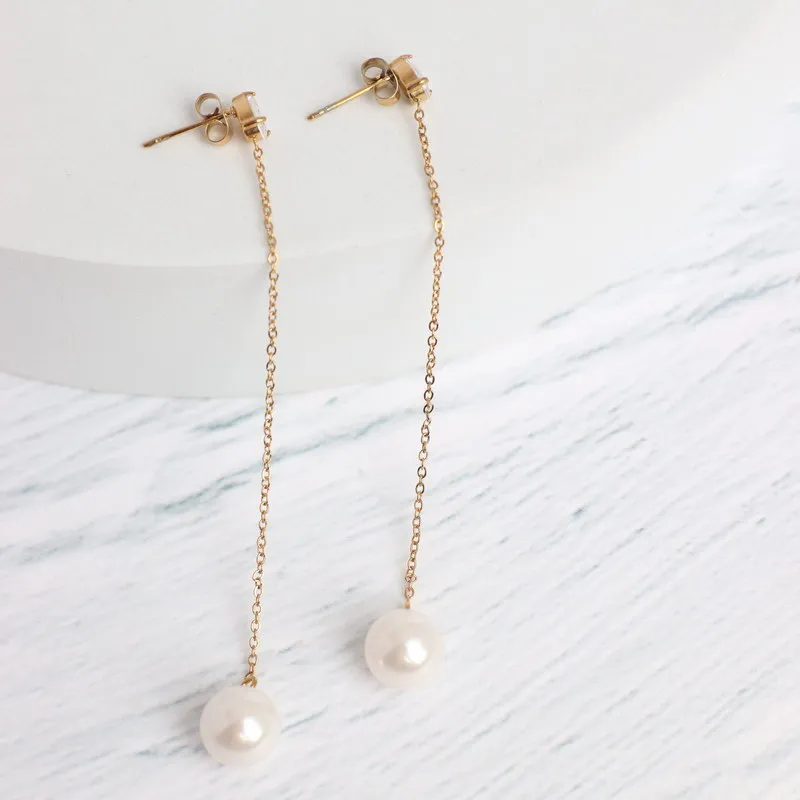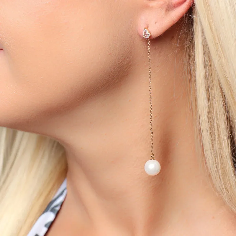 Επίχρυσα κρεμαστά σκουλαρίκια από ανοξείδωτο ατσάλι που ξεκινούν με ένα διακριτικό ζιργκόν που κάθεται στον λοβό, από το οποίο κρέμεται μια λεπτή, αέρινη αλυσίδα σε χρυσή απόχρωση. Η αλυσίδα καταλήγει σε μια λαμπερή πέρλα που αιωρείται κάτω από το αυτί, προσδίδοντας κίνηση και ρευστότητα. Το αποτέλεσμα είναι ένα minimal, μακρύ σκουλαρίκι που αναδεικνύει τον λαιμό. Το μήκος των σκουλαρικιών είναι 8.5cm.