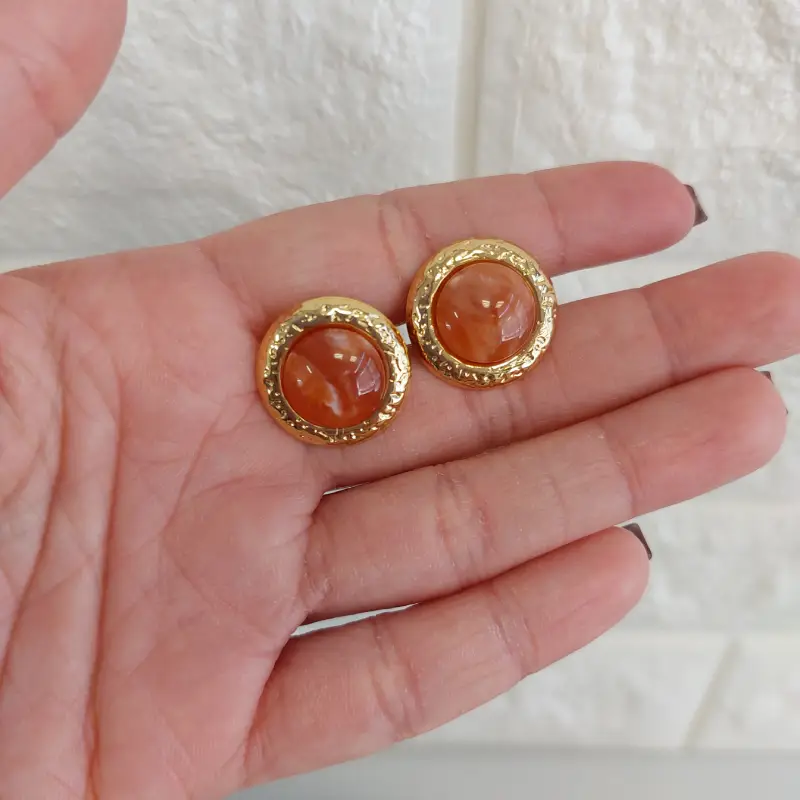 Statement καρφωτά σκουλαρίκια επίχρυσα απο ανοιξείδωτο ατσάλι σε vintage γραμμή με πορτοκαλί πέτρα. Φόρεσε τα για να δώσεις μια πινελιά χρώματος και ρετρό glamour σε ένα look. Είναι ιδανικά για να λειτουργήσουν ως το κύριο statement κόσμημα σε ένα σύνολο.