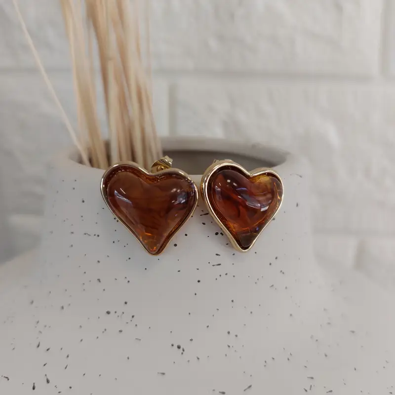 Καρφωτά σκουλαρίκια από ανοιξείδωτο ατσάλι σε σχήμα καρδιάς απο ρητίνη σε χρώμα χρυσό-καφέ που θυμίζει κεχριμπάρι. Το αποτέλεσμα είναι ένα παιχνιδιάρικο, vintage-inspired κόσμημα με έντονη προσωπικότητα. Φόρεσε τα με ζεστά, γήινα χρώματα για να αναδείξεις τη ρετρό τους γοητεία. Είναι ιδανικά για να προσθέσετε μια bohemian-chic πινελιά σε ένα καθημερινό look.