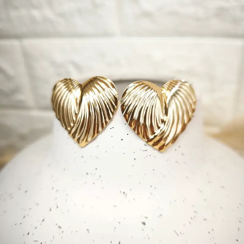 Καρφωτά σκουλαρίκια επίχρυσα απο ανοιξείδωτο ατσάλι σε σχήμα καρδιάς. Αυτά τα σκουλαρίκια επαναπροσδιορίζουν το κλασικό σχήμα καρδιάς με μια τολμηρή, τρισδιάστατη υφή. Η ιδιαίτερη υφή τους τα καθιστούν ιδανικά για όσες αγαπούν τα bold και vintage-inspired κοσμήματα. Είναι ένα κομμάτι που δηλώνει αγάπη για τη μόδα με έναν εκλεπτυσμένο τρόπο.