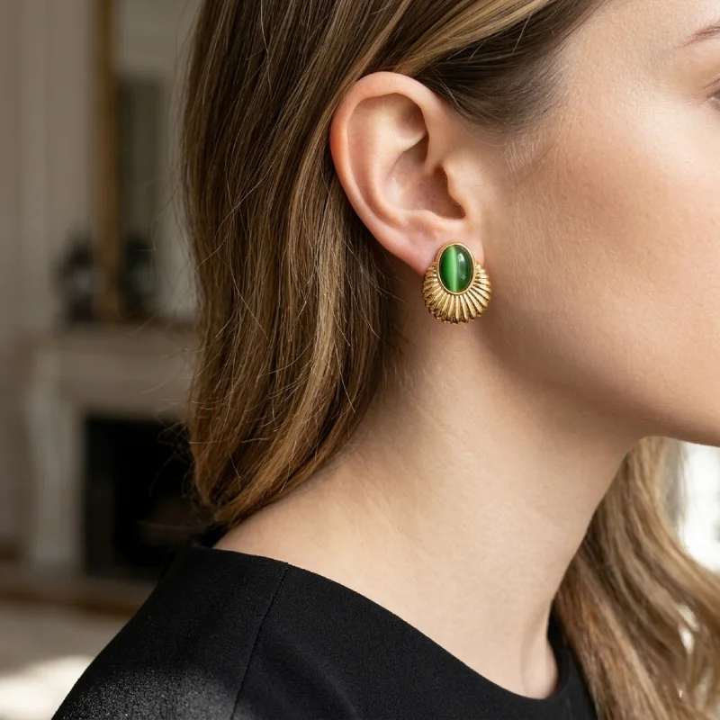 Vintage σκουλαρίκια καρφωτά σε οβάλ σχήμα, από ανοξείδωτο ατσάλι, με εντυπωσιακή πέτρα σε βαθύ σμαραγδί χρώμα με εφέ “cat eye”, η οποία αντανακλά το φως δημιουργώντας μια αίσθηση βάθους και πολυτέλειας. Πρόσθεσε μια δόση διαχρονικής γοητείας στο στυλ σου συνδυάζοντάς τα με ένα κλασικό λευκό πουκάμισο ή ένα βραδινό φόρεμα σε γήινους τόνους.