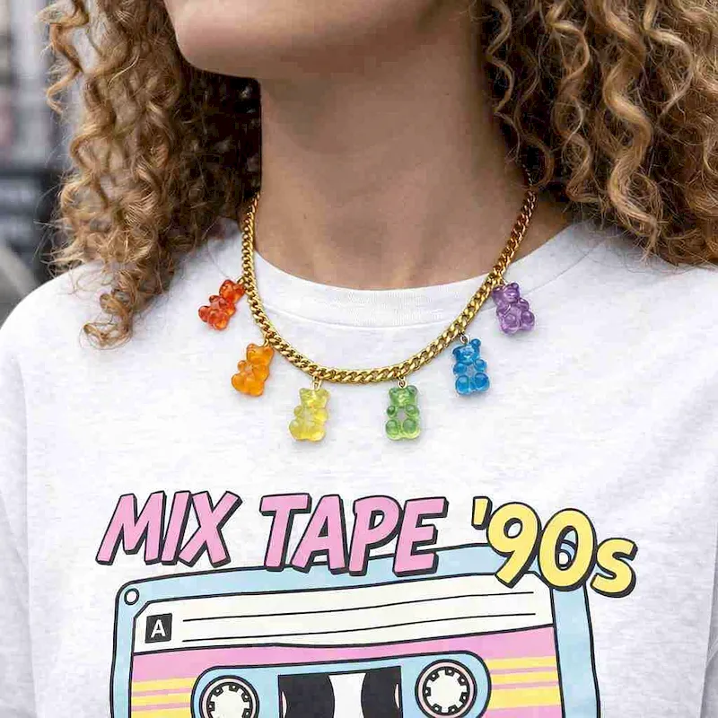 Επίχρυσο κολιέ με chunky αλυσίδα και πολύχρωμα ακρυλικά gummy bears, από ανοξείδωτο ατσάλι. Φόρεσέ το πάνω από ένα απλό λευκό T-shirt για να δώσεις μια fun πινελιά στο street style σου ή κάνε layering με λεπτότερες χρυσές αλυσίδες για ένα πιο statement, μοντέρνο αποτέλεσμα. Αποτελεί το τέλειο δώρο για όσες αγαπούν τα εκκεντρικά και πρωτότυπα αξεσουάρ. Το μήκος του κολιέ είναι 40cm και διαθέτει αλυσιδάκι επέκτασης +5cm.