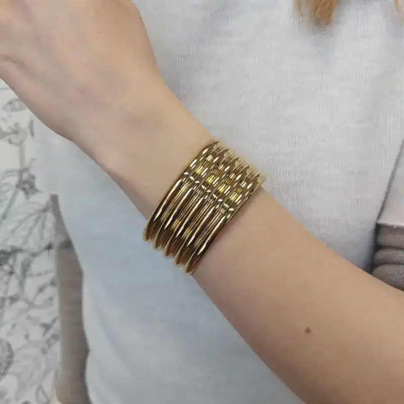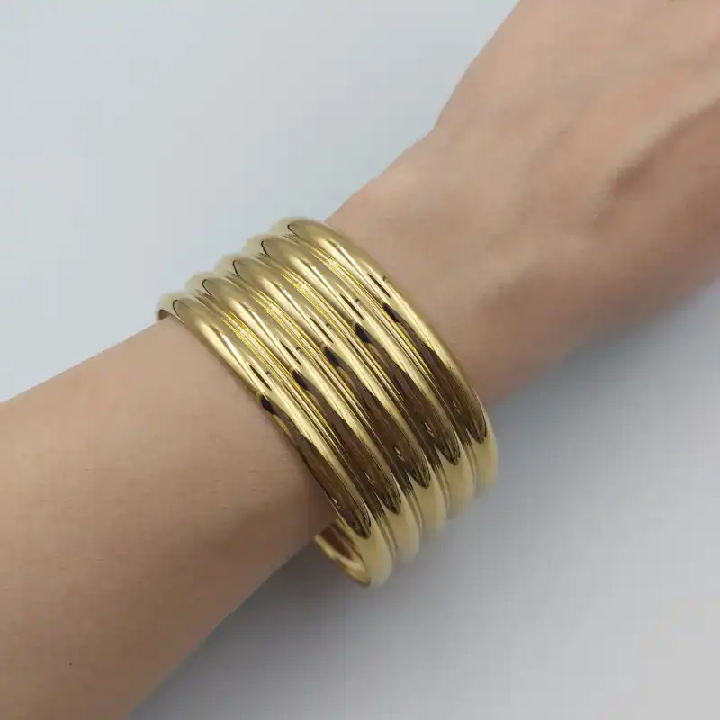 Επίχρυση φαρδιά χειροπέδα ανοιχτή από ανοξείδωτο ατσάλι. Η χειροπέδα έχει εντυπωσιακές, ανάγλυφες γραμμές που δίνουν μια μοντέρνα και δυναμική υφή. Είναι ανοιχτή και ρυθμιζόμενη, με διάμετρο 6.2cm και μπορεί να προσαρμοστεί εύκολα. Αυτή η χειροπέδα είναι το ultimate statement κομμάτι για κάθε σου εμφάνιση. Τόλμησε να φορέσεις δύο τέτοιες χειροπέδες ή μια ασημί και μία επίχρυση και το look σου θα γίνει ακόμα πιο τολμηρό.
