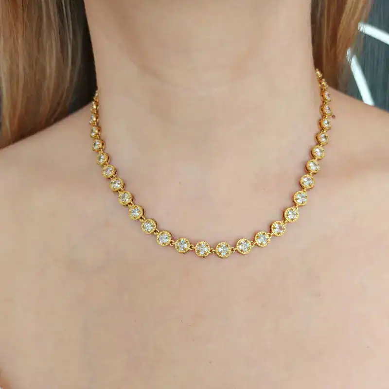 Η hot τάση του φθινοπώρου! Ετοιμάσου να λάμψεις! Αυτή η επιχρυσωμένη ριβιέρα λαιμού (Tennis Necklace) με λαμπερά στρογγυλά ζιργκόν είναι το απόλυτο αξεσουάρ για να αναβαθμίσεις την εμφάνισή σου αλλά και την διάθεση σου. Το ανοιξείδωτο ατσάλι την καθιστά ανθεκτική και ιδανική για να φοριέται κάθε μέρα, χωρίς να χάνει τη λάμψη της. Φόρεσέ τη με άλλα ατσάλινα κολιέ ή άφησέ τη να κλέψει την παράσταση μόνη της. Η ριβιέρα έχει μήκος 38cm (διαθέτει και αλυσίδα επέκτασης + 5cm).