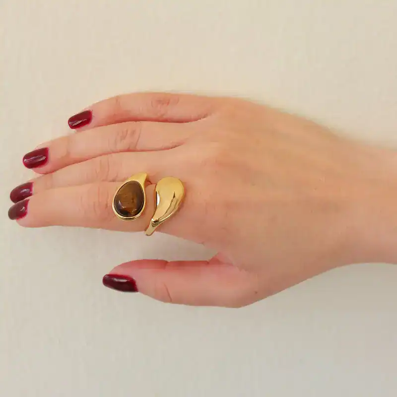 Επίχρυσο δαχτυλίδι από ανοξείδωτο ατσάλι σε ανοιχτή γραμμή με πέτρα Tiger’s Eye. Tο δαχτυλίδι αυτό είναι ενα statement κομμάτι με έντονη διάθεση. Ιδανικό για όσες αγαπούν τα μεγάλα δαχτυλίδια που ξεχωρίζουν, θυμίζοντας vintage luxury κοσμήματα.
