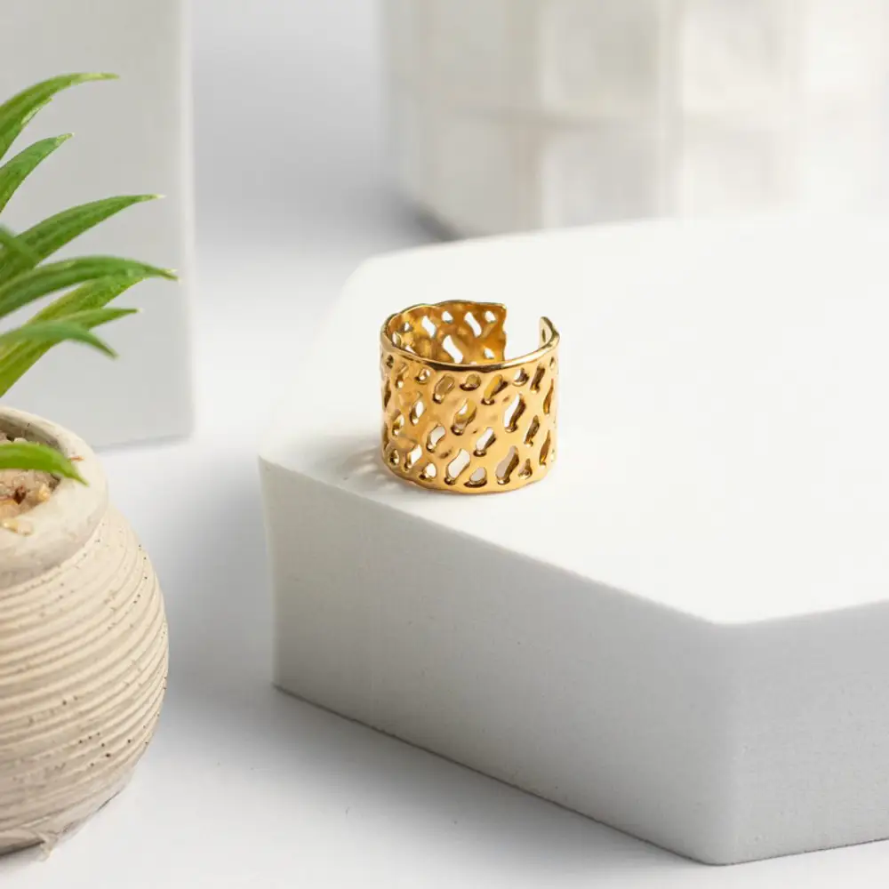 Επίχρυσο δαχτυλίδι προσαρμοζόμενο, από ανοξείδωτο ατσάλι, σε μοτίβο διάτρητου κύβου. Ένα statement δαχτυλίδι που θα σε συνοδεύσει σε όλες τις βραδινές σου εξόδους, μιας και η αρχιτεκτονική του αισθητική του δίνει μια πολυτελή αίσθηση.
