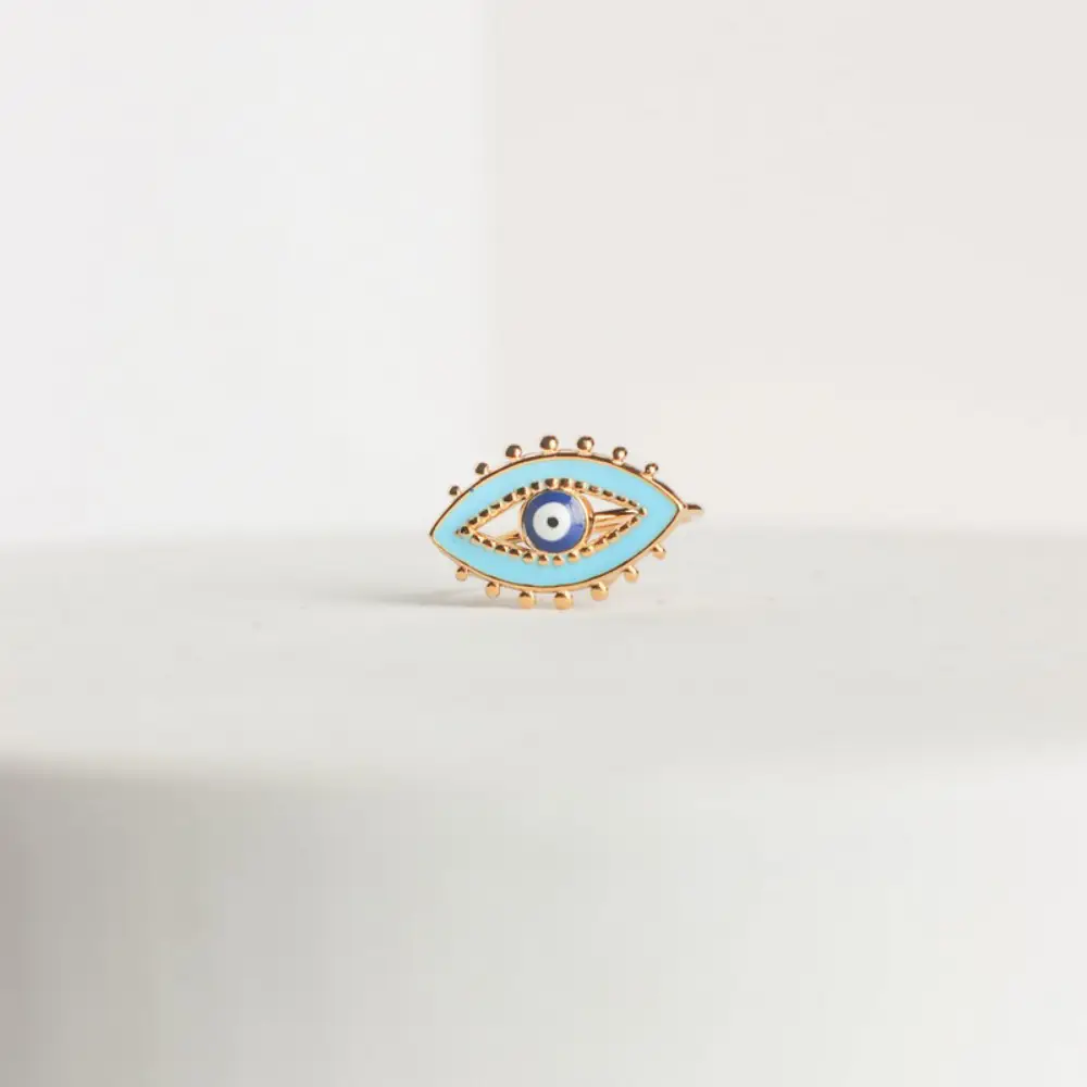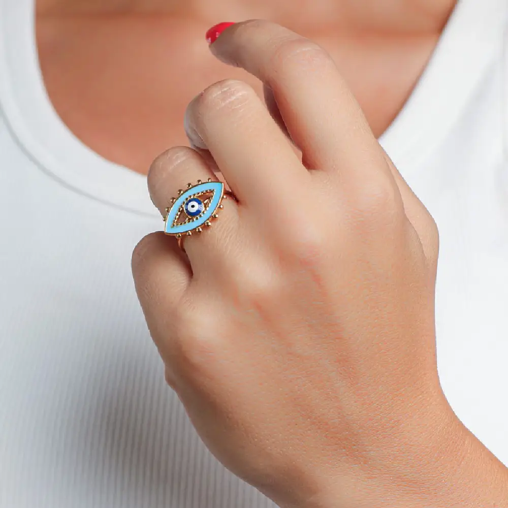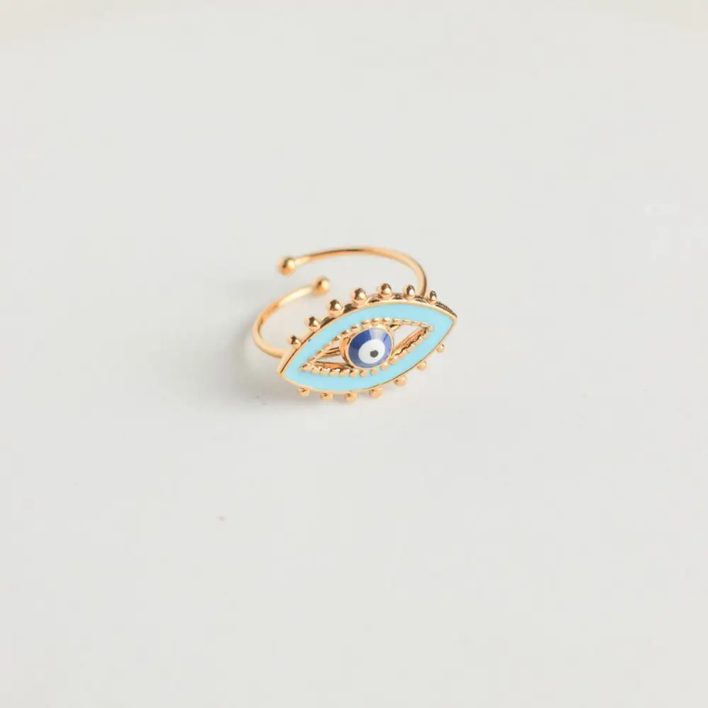 Επίχρυσο προσαρμοζόμενο δαχτυλίδι Evil Eye από ανοξείδωτο ατσάλι με ένα εντυπωσιακό μάτι με ζωηρό μπλέ και τιρκουάζ σμάλτο και διακριτικές επίχρυσες λεπτομέρειες, που προσθέτουν χρώμα και ένταση. Ένα διαχρονικό δαχτυλίδι που μπορεί να συνδυαστεί εύκολα με άλλα δαχτυλίδια.