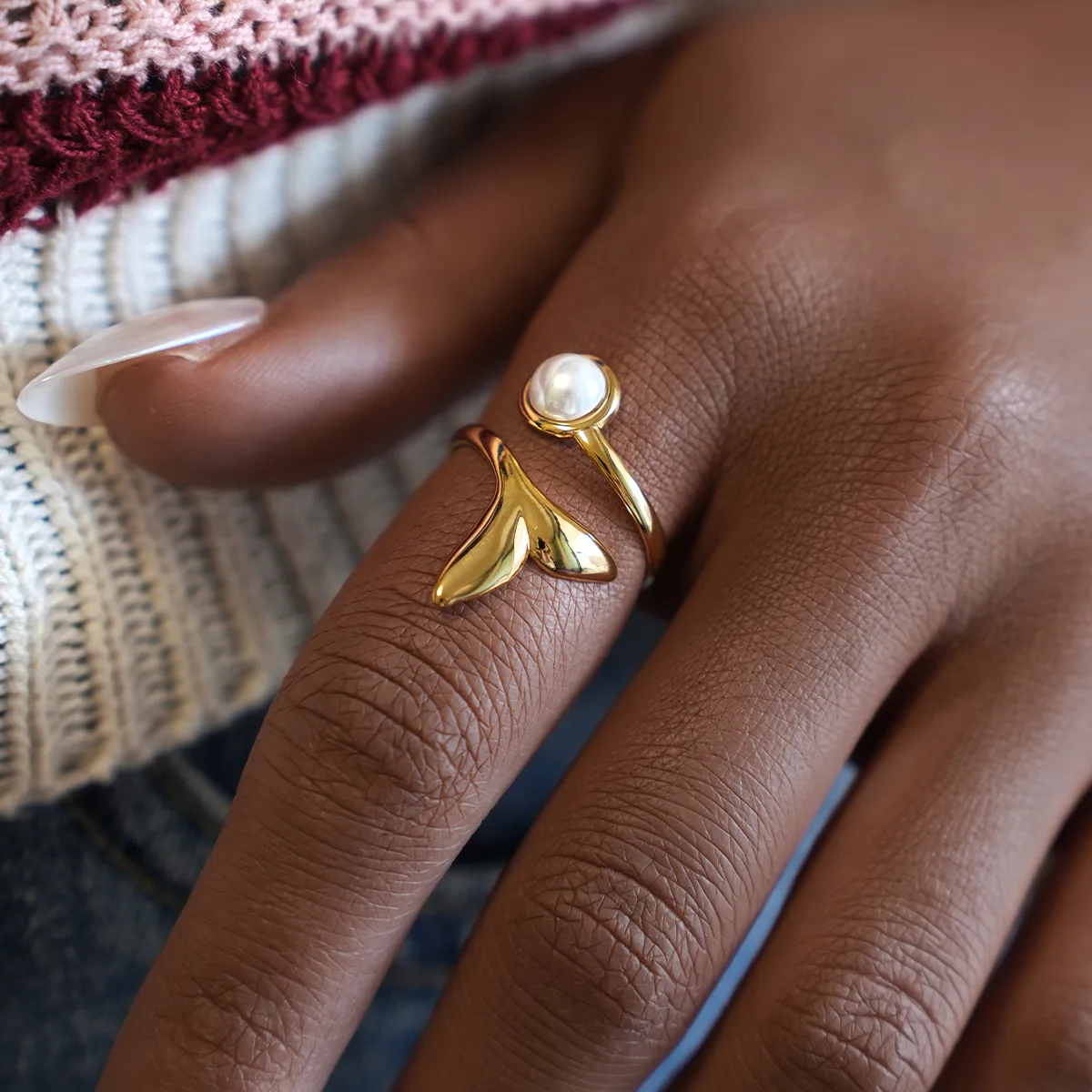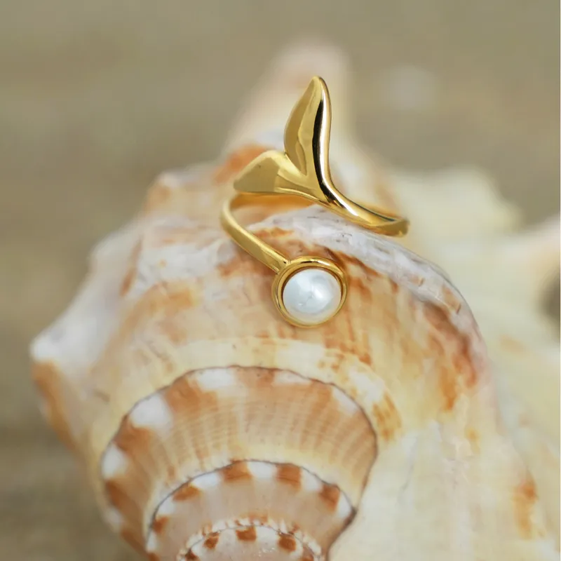 Επίχρυσο ρυθμιζόμενο δαχτυλίδι από ανοξείδωτο ατσάλι, σε σχέδιο ουράς δελφινιού και πέρλα. Λόγω του ρυθμιζόμενου σχήματός του, το δαχτυλίδι “αγκαλιάζει” το δάχτυλο προσφέροντας τέλεια εφαρμογή σε κάθε δάχτυλο.