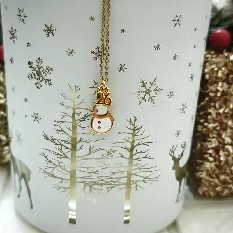 Χειροποίητο κολιέ από ατσάλι γούρι 2026. Διαθέτει κομψή, επίχρυση ατσάλινη αλυσίδα και ένα παιχνιδιάρικο μενταγιόν σε σχήμα χιονάνθρωπου από λευκό σμάλτο. Το design συμπληρώνεται από τον αριθμό ’26’ για καλή τύχη και εορταστική διάθεση. Είναι ένα διακριτικό και γλυκό κόσμημα, ιδανικό για να προσθέσει χειμερινή αισθητική στο ντύσιμό σου. Το μήκος του κολιέ είναι 40cm και διαθέτει αλυσιδάκι επέκτασης +5cm. Ιδανικό δώρο Χριστουγέννων για εσένα ή τα αγαπημένα σου πρόσωπα.