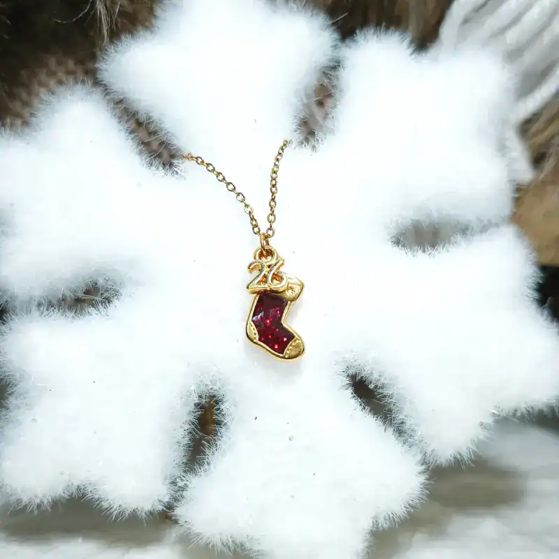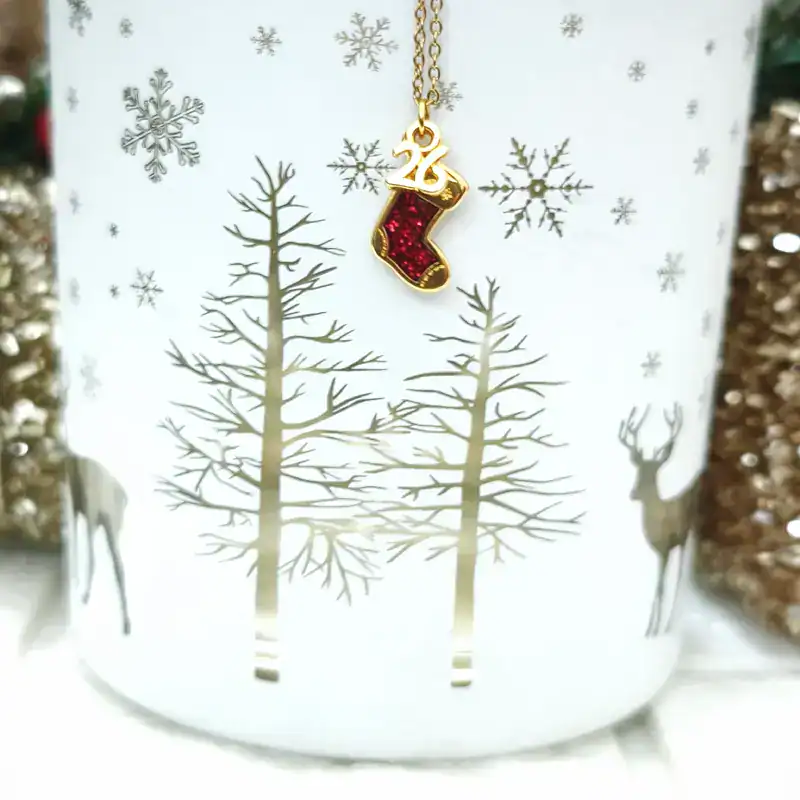 Χειροποίητο κολιέ από ατσάλι γούρι 2026. Διαθέτει λεπτή, κομψή επίχρυση ατσάλινη αλυσίδα και ένα λαμπερό χριστουγεννιάτικο μοτίφ σε σχήμα κάλτσας δώρων. Το μενταγιόν είναι διακοσμημένο με σμάλτο σε κόκκινο glitter, προσδίδοντας λάμψη και χαρά στο look. Είναι ένα διακριτικό αλλά εντυπωσιακό κόσμημα, ιδανικό για να φορεθεί όλη τη διάρκεια των γιορτών. Το μήκος του κολιέ είναι 40cm και διαθέτει αλυσιδάκι επέκτασης +5cm. Φόρεσέ το για να προσθέσεις γιορτινό πνεύμα και στυλ σε κάθε σου εμφάνιση. Ιδανικό δώρο Χριστουγέννων για εσένα ή τα αγαπημένα σου πρόσωπα.