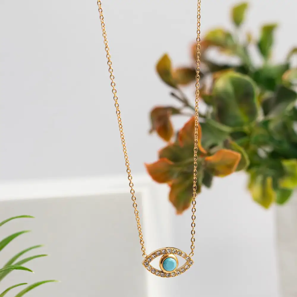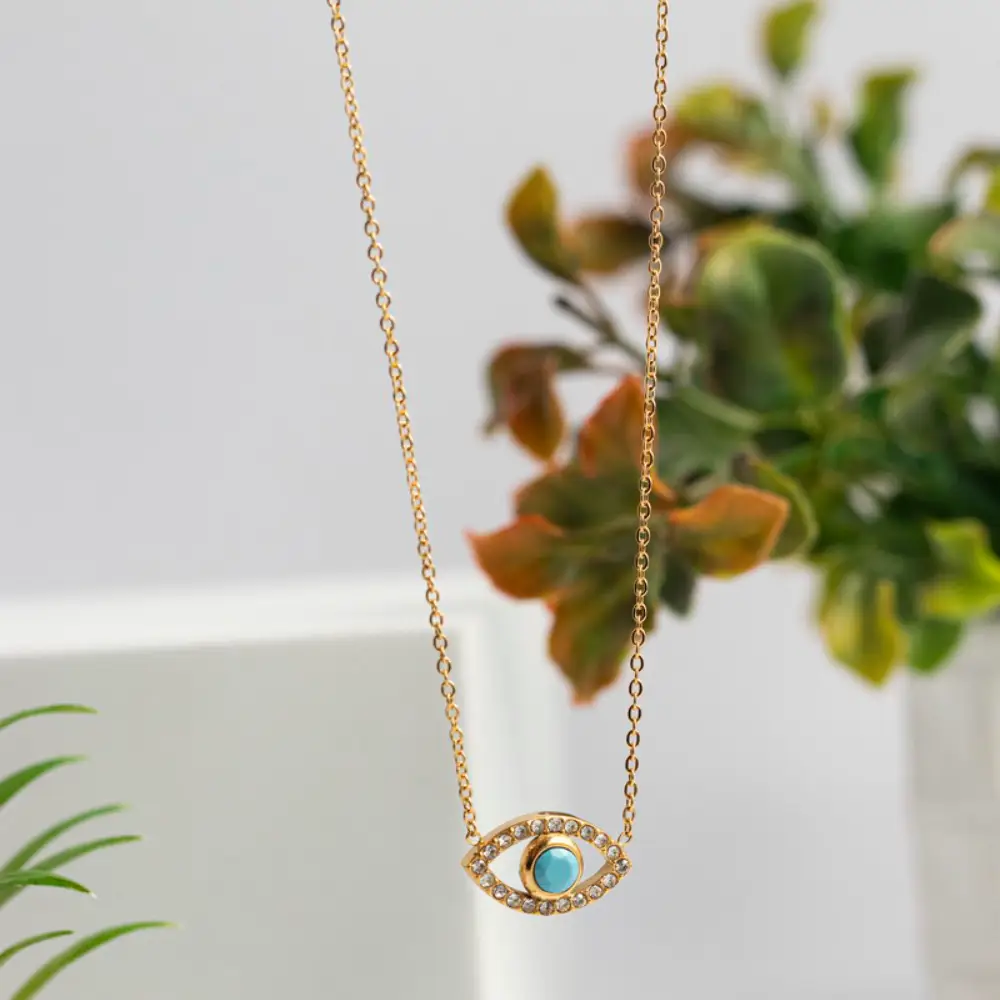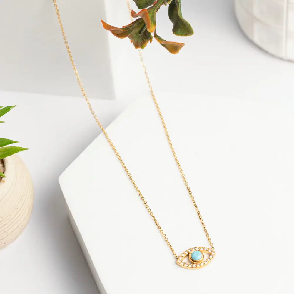 Επίχρυσο κολιέ Evil Eye από ανοξείδωτο ατσάλι με ένα εντυπωσιακό μάτι, διακοσμημένο με μία λαμπερή τιρκουάζ πέτρα στην ίριδα και περιτριγυρισμένο από αστραφτερά ζιργκόν. Ένα διαχρονικό κολιέ που συνδυάζεται εύκολα με άλλες αλυσίδες και κολιέ. Ταιριάζει απίστευτα με λευκά και τζιν. Το μήκος του κολιέ είναι 40cm και έχει και αλυσιδάκι επέκτασης +6cm.