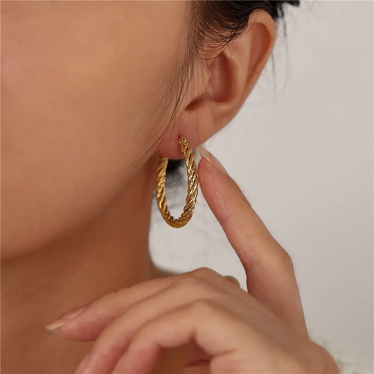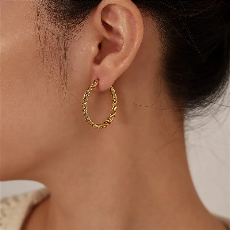 Σκουλαρίκια κρίκοι σε μεσαίο μέγεθος, από ανοξείδωτο ατσάλι, με εντυπωσιακό στριφτό (twisted) σχέδιο που θυμίζει σχοινί. Η ανάγλυφη επιφάνειά τους αντανακλά το φως με μοναδικό τρόπο, προσφέροντας μια διαχρονική αλλά και σύγχρονη αισθητική. Εξαιρετικά ελαφριά σκουλαρίκια που μπορείς να τα συνδυάσεις εύκολα με κάθε outfit.