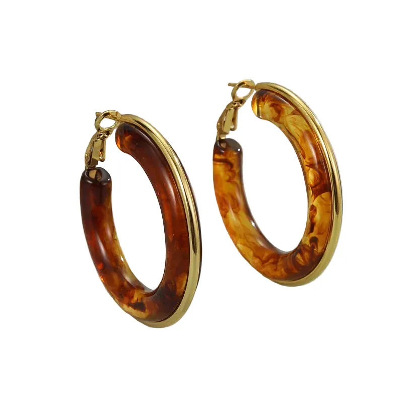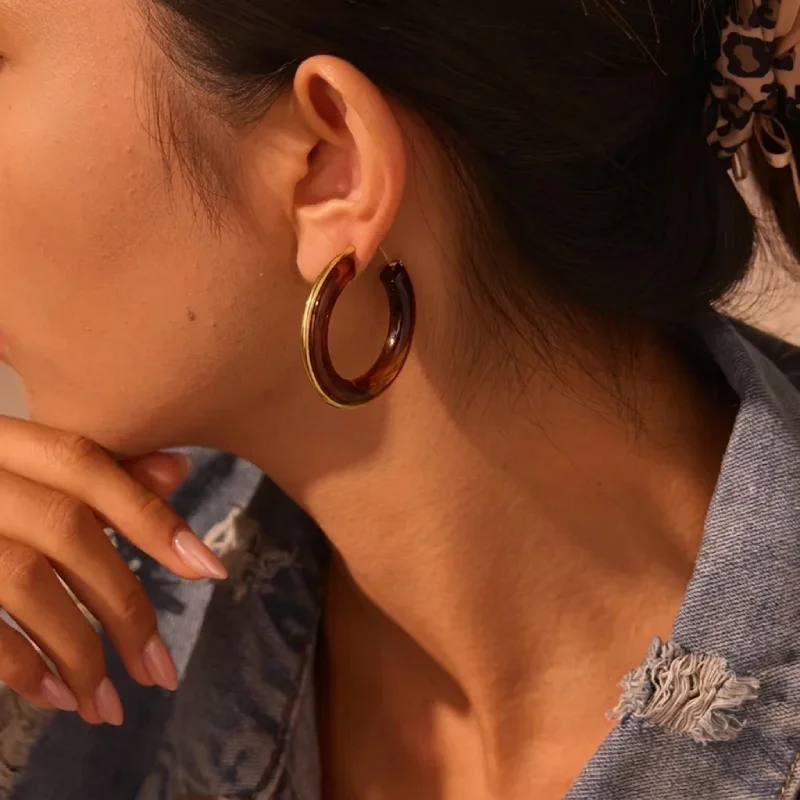 Σκουλαρίκια κρίκοι σε φαρδύ, μοντέρνο σχέδιο, από επιχρυσωμένο ανοξείδωτο ατσάλι με καφέ ρητίνη. Αποτελούν το ιδανικό αξεσουάρ για να ολοκληρώσεις ένα bohemian look, συνδυάζοντάς τα με αέρινα φορέματα, λινά υφάσματα ή πλεκτά tops.
