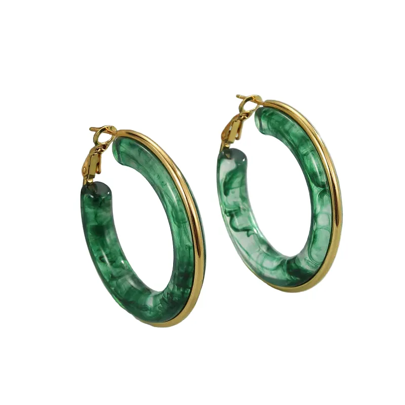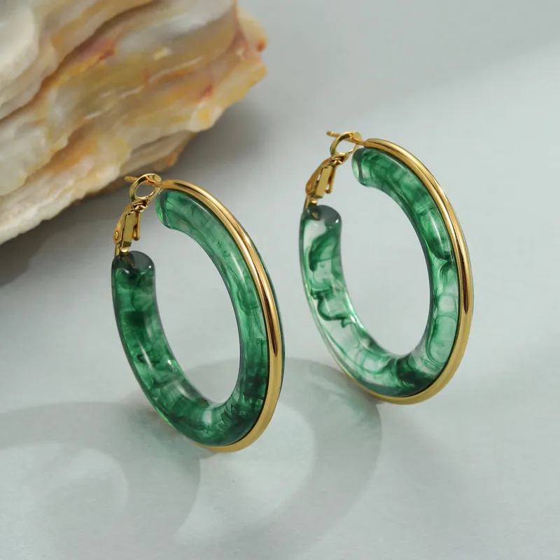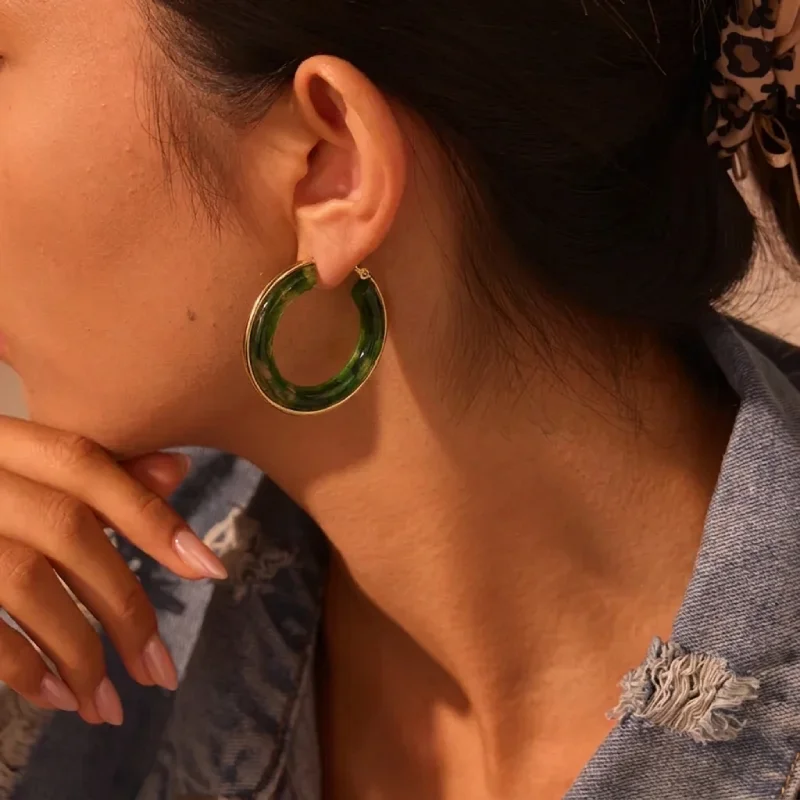 Σκουλαρίκια κρίκοι σε φαρδύ, μοντέρνο σχέδιο, από επιχρυσωμένο ανοξείδωτο ατσάλι με πράσινη ρητίνη. Αποτελούν το ιδανικό αξεσουάρ για να ολοκληρώσεις ένα bohemian look, συνδυάζοντάς τα με αέρινα φορέματα, λινά υφάσματα ή πλεκτά tops.
