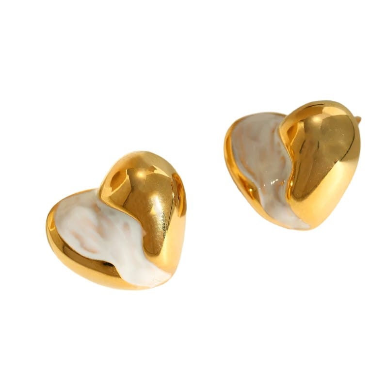 Σκουλαρίκια από επιχρυσωμένο ανοξείδωτο ατσάλι, σε σχήμα καρδιάς. Το επιχρυσωμένο ατσάλι συνδυάζεται αρμονικά με ένα λευκό, μαρμαροειδές φινίρισμα, δημιουργώντας μια εντυπωσιακή δίχρωμη καρδιά. Ο συνδυασμός του λαμπερού χρυσού με το απαλό λευκό προσδίδει μια αίσθηση ρομαντισμού και μοντέρνας κομψότητας, ιδανικά για να προσθέσετε μια γλυκιά και ξεχωριστή πινελιά στην εμφάνισή σας. Διαστάσεις: 1.7+1.4 cm