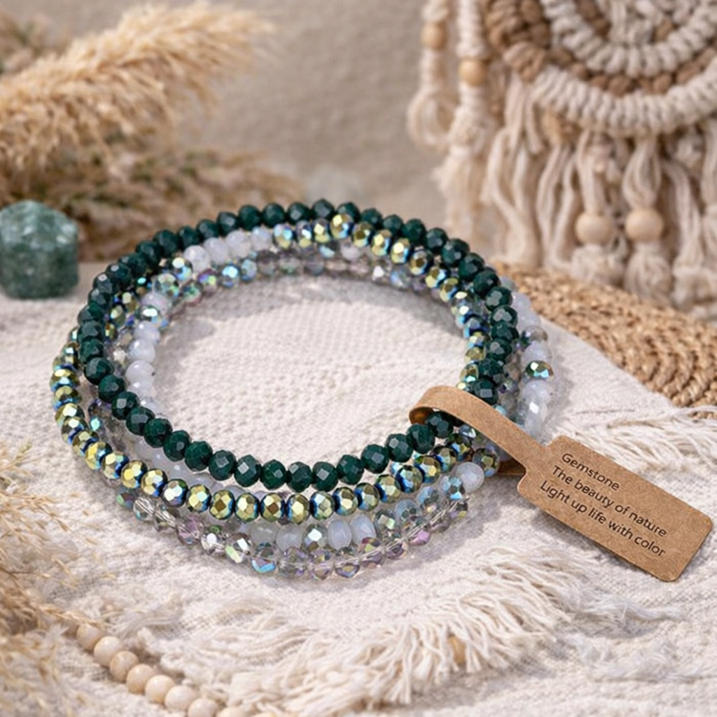 Σετ 4 βραχιολιών με λάστιχο και κρυσταλλικές χάντρες, σε αποχρώσεις του πράσινου και του γκρι. Το σετ περιλαμβάνει διαφορετικές υφές χαντρών (faceted, frosted, και ιριδίζουσες), επιτρέποντάς σας να τα φορέσετε όλα μαζί για ένα έντονο stackable look ή μεμονωμένα για μια πιο διακριτική εμφάνιση με ρομαντική αισθητική. Η λάμψη των κρυστάλλων και οι ζεστές αποχρώσεις τους τα καθιστά ιδανική επιλογή για να προσθέσετε χρώμα και στυλ σε καθημερινά και καλοκαιρινά σύνολα, όπως λευκά λινά φορέματα ή casual outfits με τζιν, ενώ αποτελούν ένα ευέλικτο αξεσουάρ που συνδυάζει την πολυτέλεια του κρυστάλλου με την άνεση της ελαστικής εφαρμογής. Τα βραχιόλια είναι με λάστιχο για να έχει έυκολη εφαρμογή σε κάθε καρπό. Στην φυσική του μορφή η εσωτερική διάμετρος είναι 5.5 cm.
