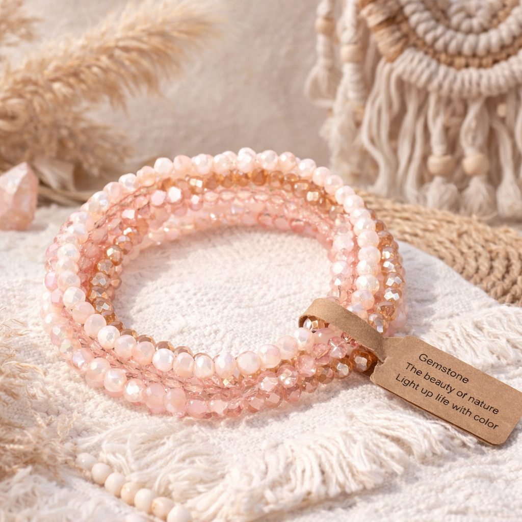Σετ 4 βραχιολιών με λάστιχο και κρυσταλλικές χάντρες, σε απαλές αποχρώσεις του ροζ και του σομόν. Το σετ περιλαμβάνει διαφορετικές υφές χαντρών (faceted, frosted, και ιριδίζουσες), επιτρέποντάς σας να τα φορέσετε όλα μαζί για ένα έντονο stackable look ή μεμονωμένα για μια πιο διακριτική εμφάνιση με ρομαντική αισθητική. Η λάμψη των κρυστάλλων και οι ζεστές αποχρώσεις τους τα καθιστά ιδανική επιλογή για να προσθέσετε χρώμα και στυλ σε καθημερινά και καλοκαιρινά σύνολα, όπως λευκά λινά φορέματα ή casual outfits με τζιν, ενώ αποτελούν ένα ευέλικτο αξεσουάρ που συνδυάζει την πολυτέλεια του κρυστάλλου με την άνεση της ελαστικής εφαρμογής. Τα βραχιόλια είναι με λάστιχο για να έχει έυκολη εφαρμογή σε κάθε καρπό. Στην φυσική του μορφή η εσωτερική διάμετρος είναι 5.5 cm.